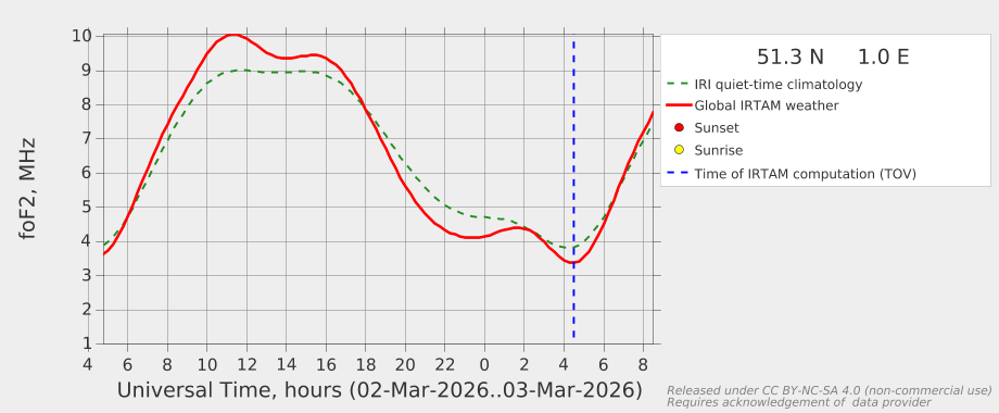 This image is an indicator of the current ionospheric data and is supplied via the Lowell GIRO Data Centre. They obviously tried very hard to discover a catchy name as the name of the model is called Global Assimilatative Model of Bottomside Ionosphere Timeline (GAMBIT). You couldn't make it up - well they obviously did!
